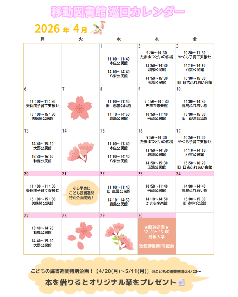 ➡へるん号ってなに? ➡巡回先・巡回表 ➡利用案内 ➡臨時巡回 ➡旧移動図書館 だんだん号