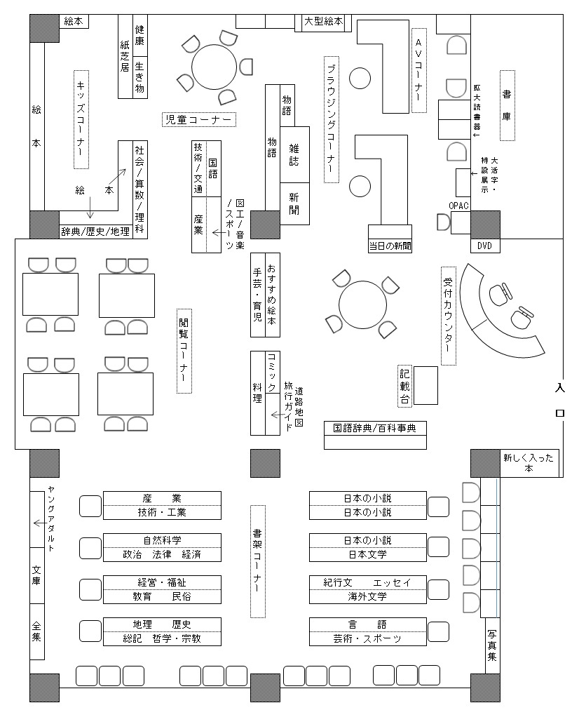 開架室はワンフロアーで、一般・児童の資料を配架しています。