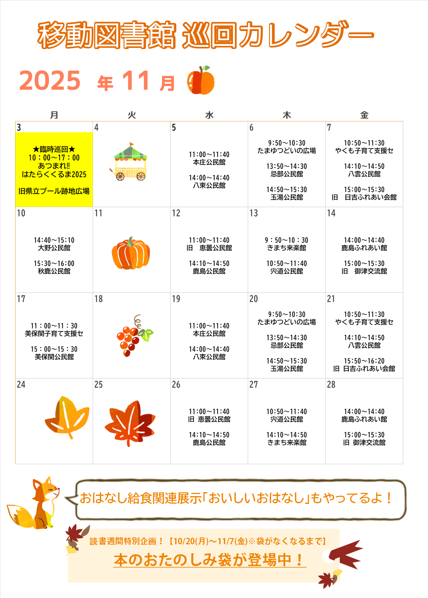 11月 移動図書館巡回予定表 2025年10月25日 最終更新日時 : 2025年11月1日 library 移動図書館 本のかけはし だんだん号 11月の巡回予定です。皆様のご来館をお待ちしております。 ※大雨・台風・猛暑などで運行を中止する可能性があります。 R7年11月移動図書館巡回カレンダーダウンロード R7年11月ステーション別巡回表ダウンロード