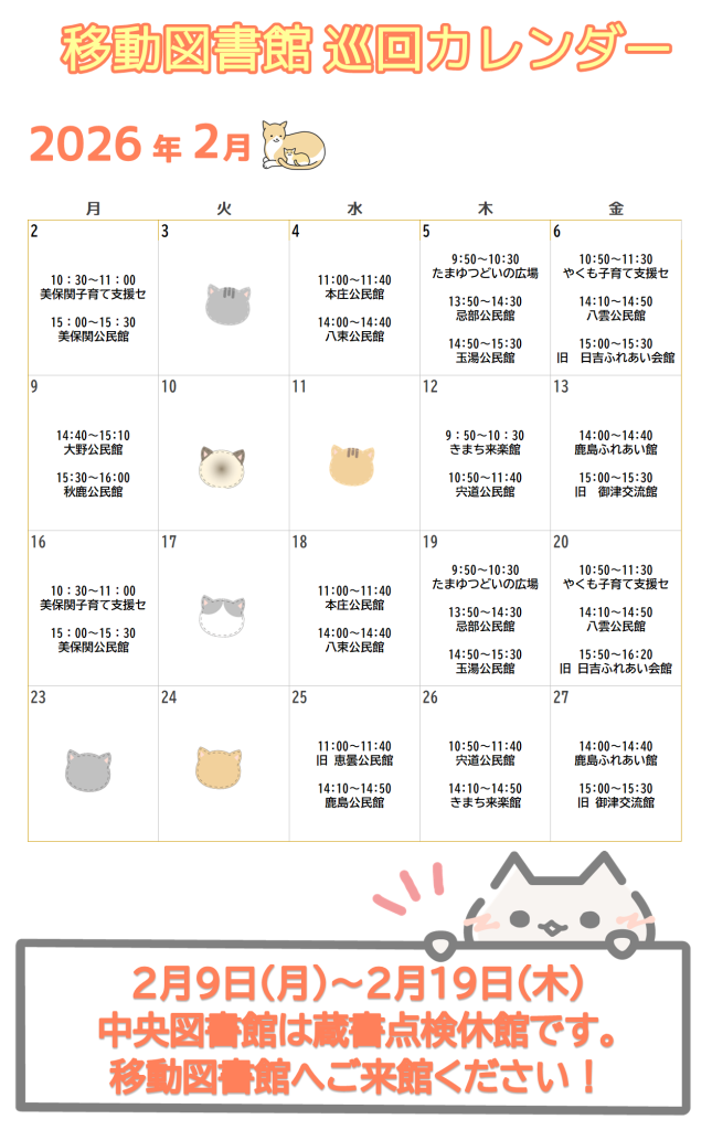 2月 移動図書館巡回予定表 2026年1月31日 最終更新日時 : 2026年2月4日 library 移動図書館 本のかけはし だんだん号 2月の巡回予定です。皆様のご来館をお待ちしております。 ※大雨・台風・雪などで運行を中止する可能性があります。 R8年2月移動図書館巡回カレンダーダウンロード R8年2月ステーション別巡回表ダウンロード