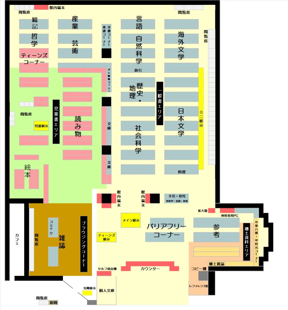 ➡開架室案内図 ➡開架室の案内 ➡新聞 ➡学習室 ➡おはなしのへや ➡小泉八雲資料室 ➡ブックポスト ➡アクセス・お問合せ