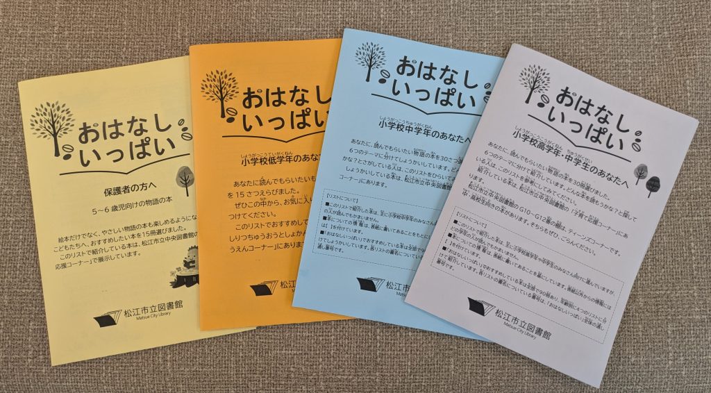 松江市立中央図書館では、2018年より「おはなしいっぱい」というブックリストで、こどもたちにおすすめしたい幼年向けの物語100冊を紹介してきました。小学生向きのリストを望まれる声もあり、2026年2月「おはなしいっぱい」をリニューアルいたしました。松江市立図書館の司書が選んだ本を、対象年齢に合わせて、4つのリストでご紹介します。